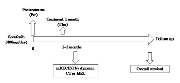 切除不能肝細胞がん患者25例を対象としました(前向きパイロット試験*2)。治療開始直前、治療開始1か月後に、末梢血TEM頻度を調べました。また、血清中の血管新生関連因子(VEGF,アンギオポエチン, 可溶性Tie-2*3)と臨床病理学的因子も同時に解析しました。治療1−3か月後にCT/MRIによる効果判定を行いました(mRECIST基準*4) (図3)。
